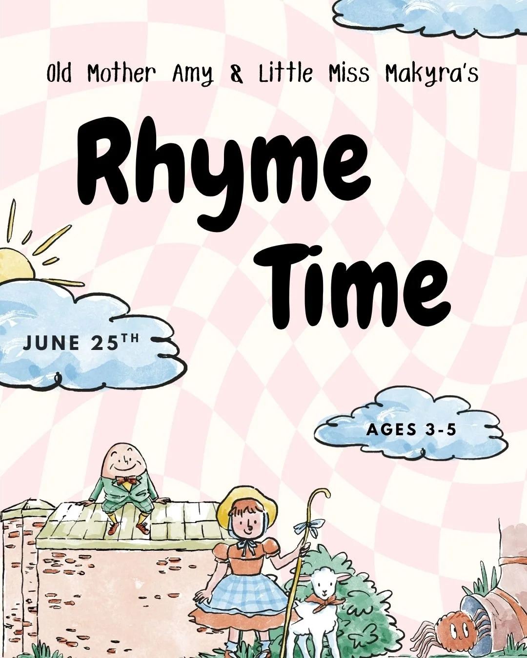 Join us for a rhyme-tastic adventure where little learners can twinkle, tumble, and roll through their favorite nursery rhymes through songs and fingerplays!