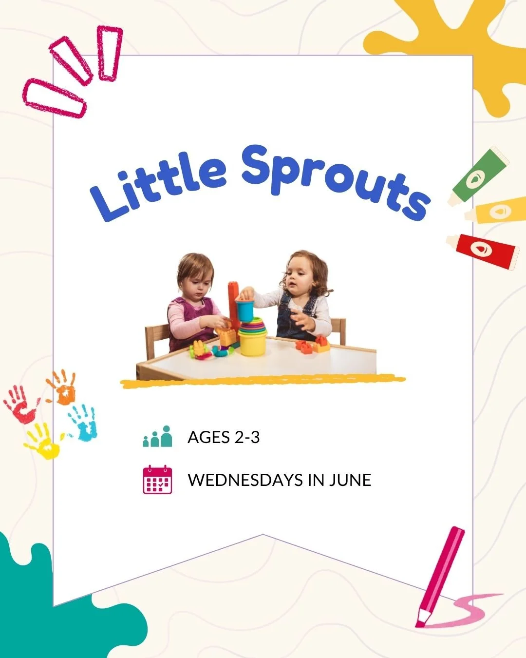 Little Sprouts is a play-based group for 2 to 3-year-olds that targets age-appropriate play skills, such as turn-taking, sharing, and playing cooperatively with other children.