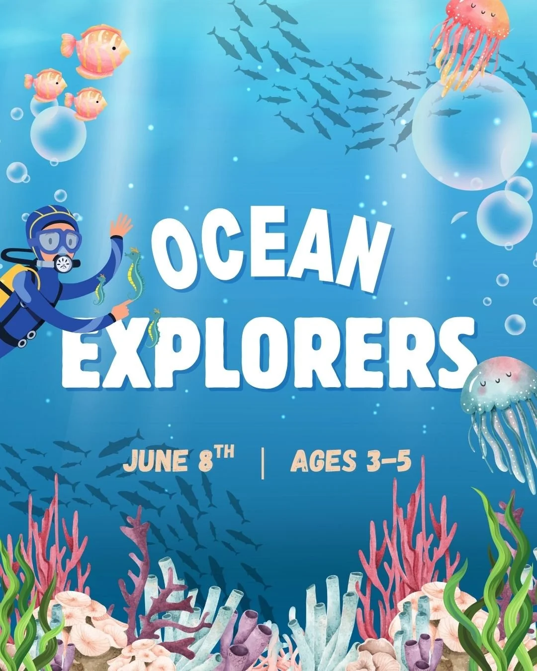 This group will consist of themed activities including, the reading of The Three Little Fish and the Big, Bad, Shark, eating a beachy-snack, creating a jellyfish suncatcher and ocean sensory bottle to take home, and enjoy an ocean animal sensory bin as well as free play with kinetic sand.